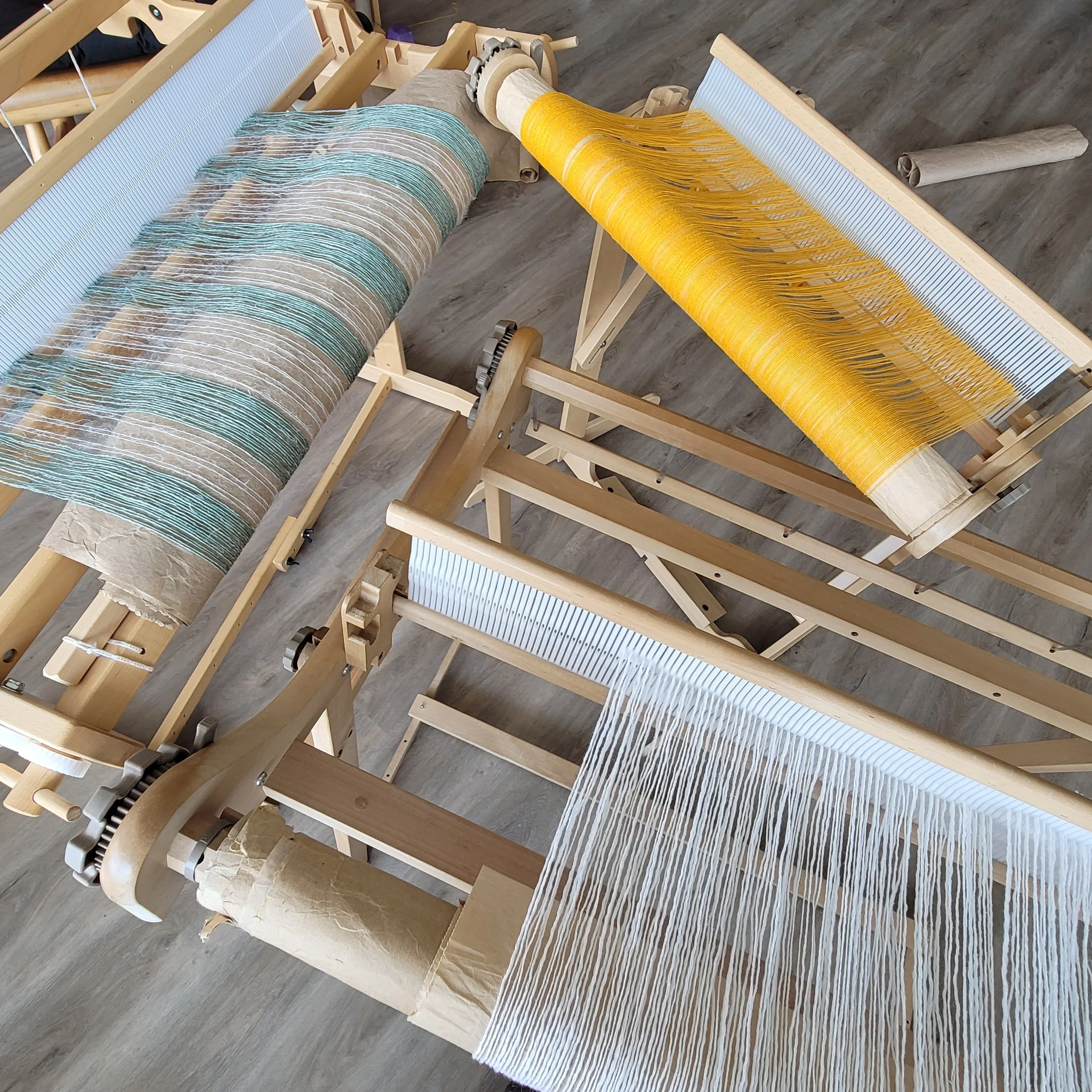 All was going well, looms were being used but I still had a desire for that 60” four shaft. And wouldn’t you know, one came up on Marketplace for a great price and delivery included! Can’t say no to that! I gave my 36” four shaft to a new weaver and brought in the 60”. With a sectional beam…always get a sectional beam, trust me!