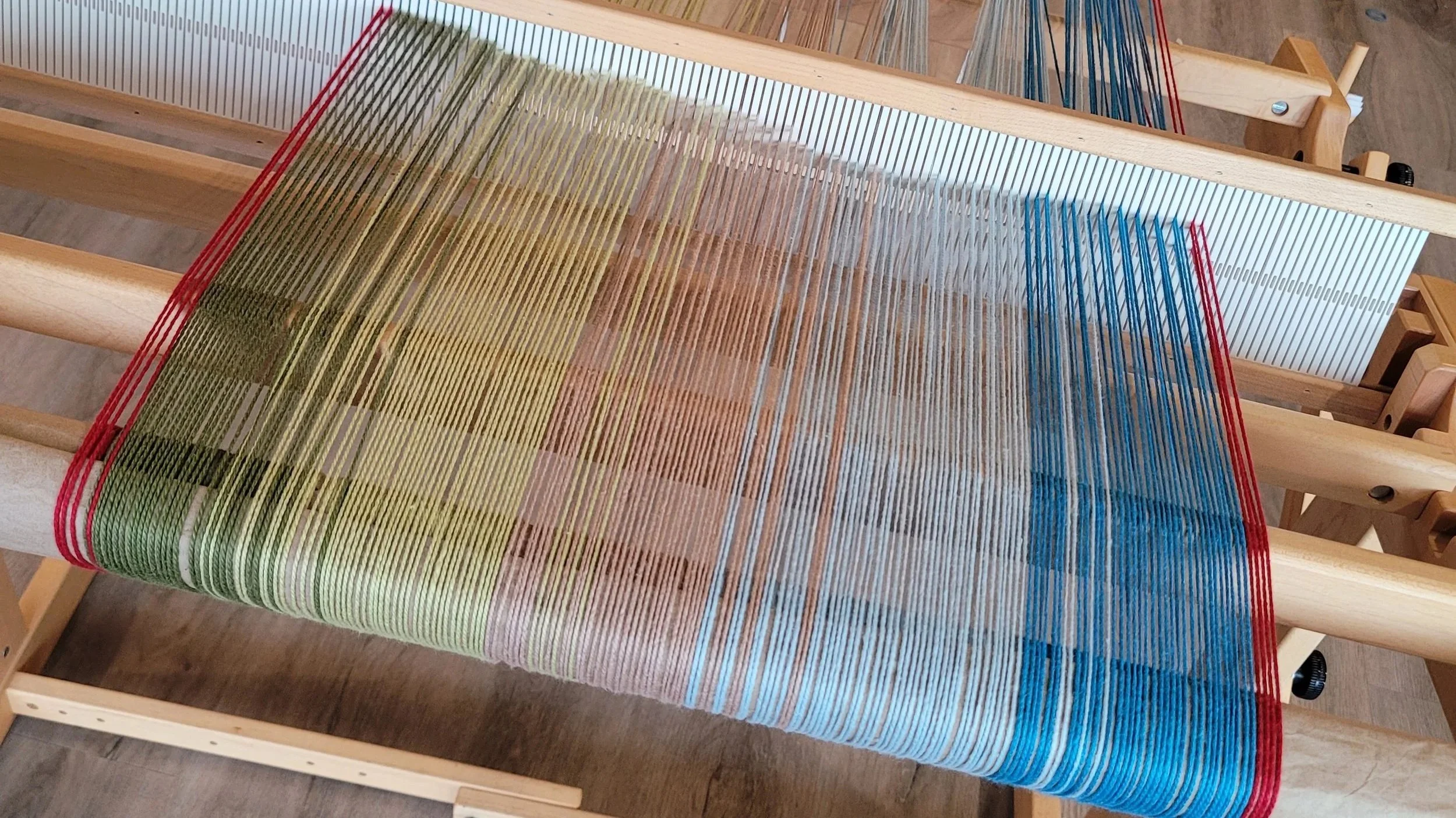 Yarn: Gist Beam 3/2 cotton in your choice of colours - I used 6. A bright pop on the edges works well! I faded from darker at the edges to paler colours in the center, then back out to the darker colours. This produced a fabric that feels very peaceful.