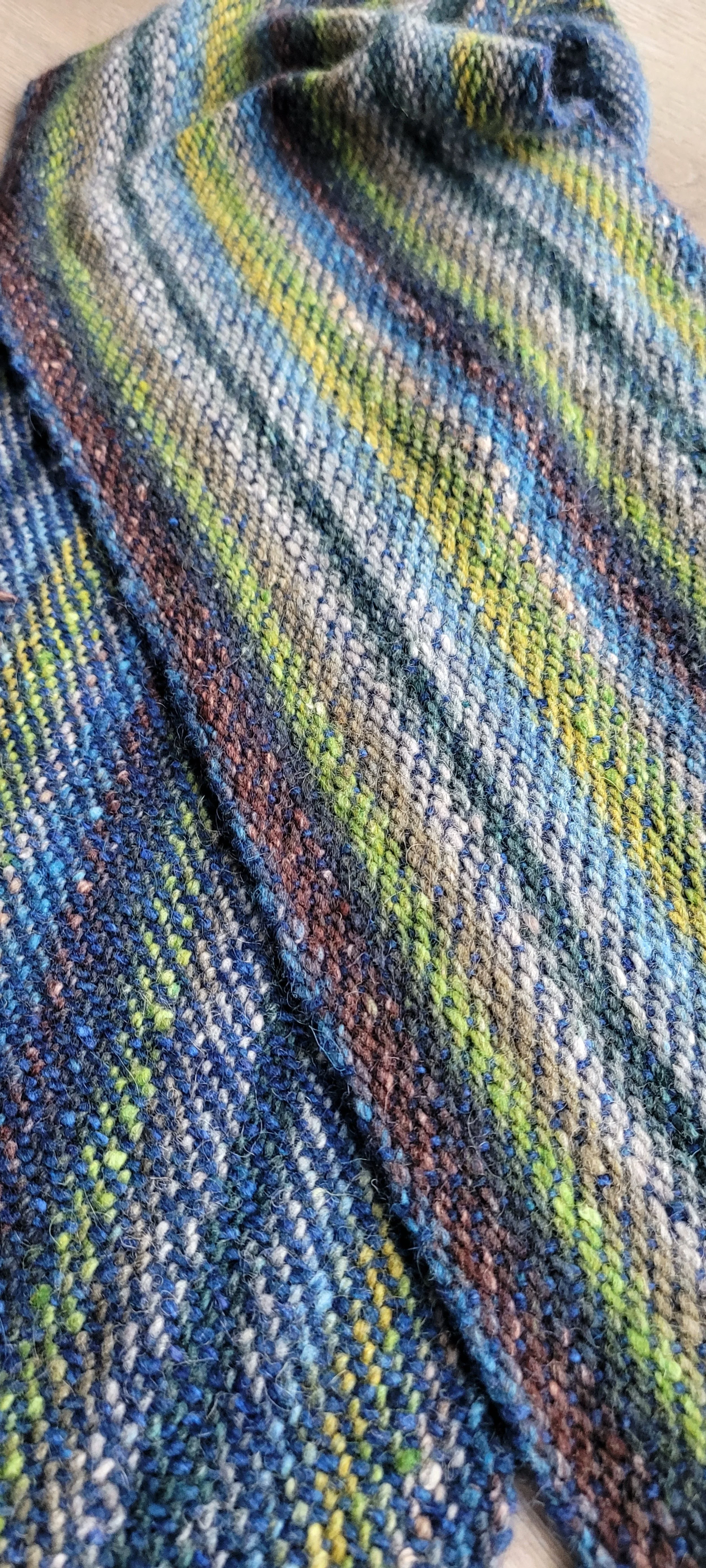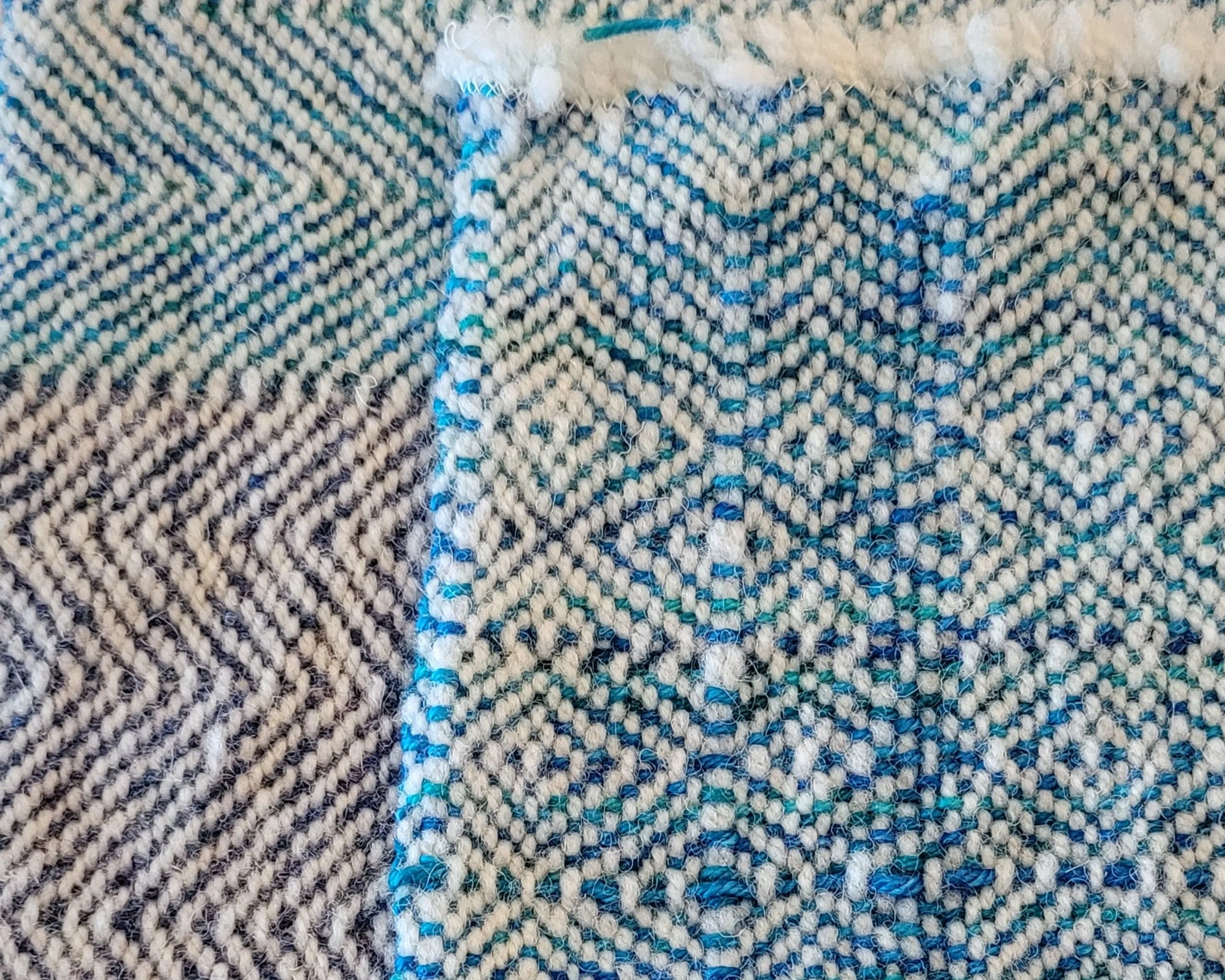 This piece is called a twill gamp. It shows the different threadings and how the pattern forms with different weaving sequences. You can see each section where I changed the threading and the order of the picks (treadling). You can also see where I’ve made mistakes!! Because this was a practise piece, I didn’t go back and fix the mistakes. I did however keep track of the threading patterns and the weaving patterns so I can weave the individual patterns again.